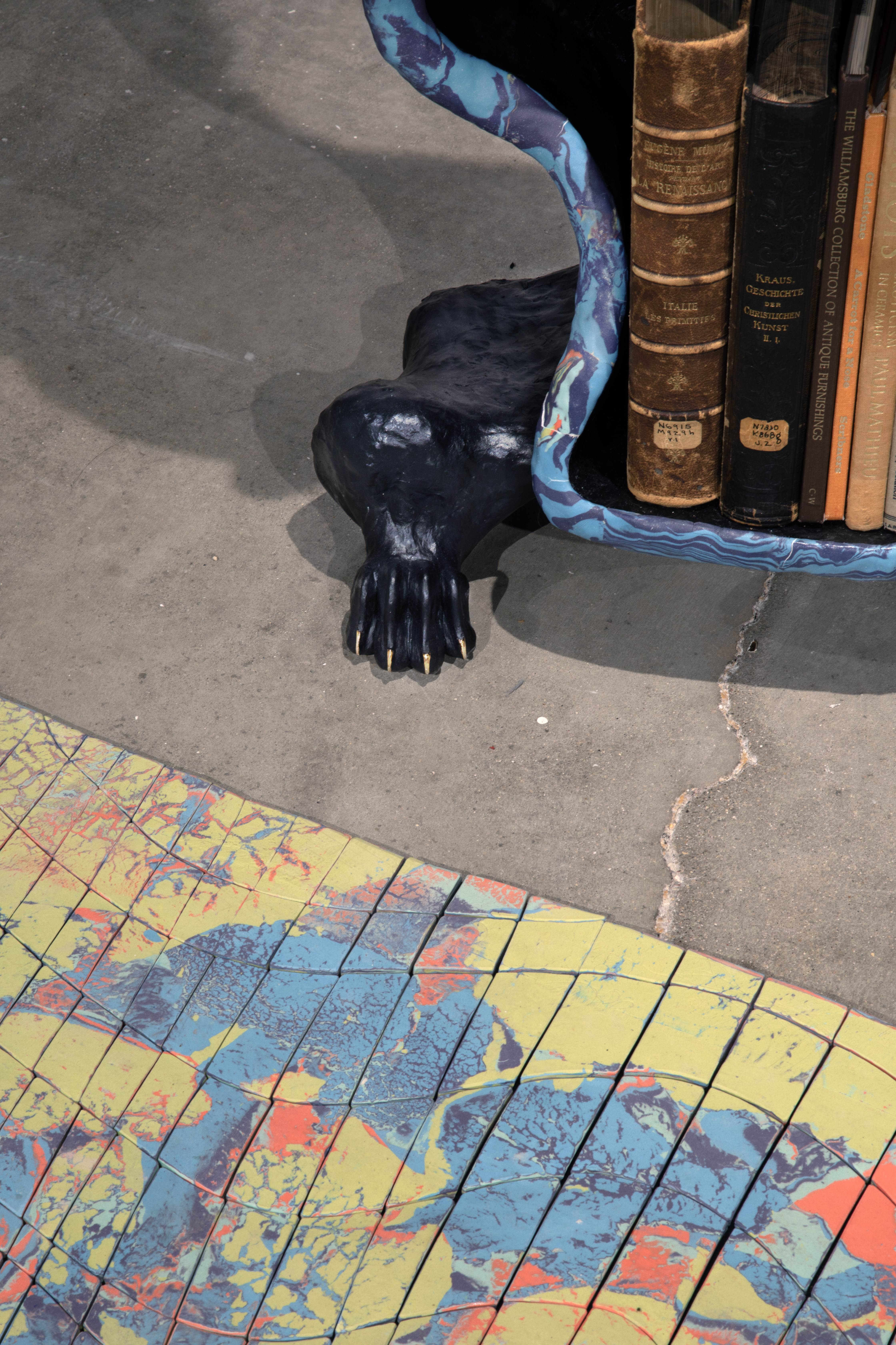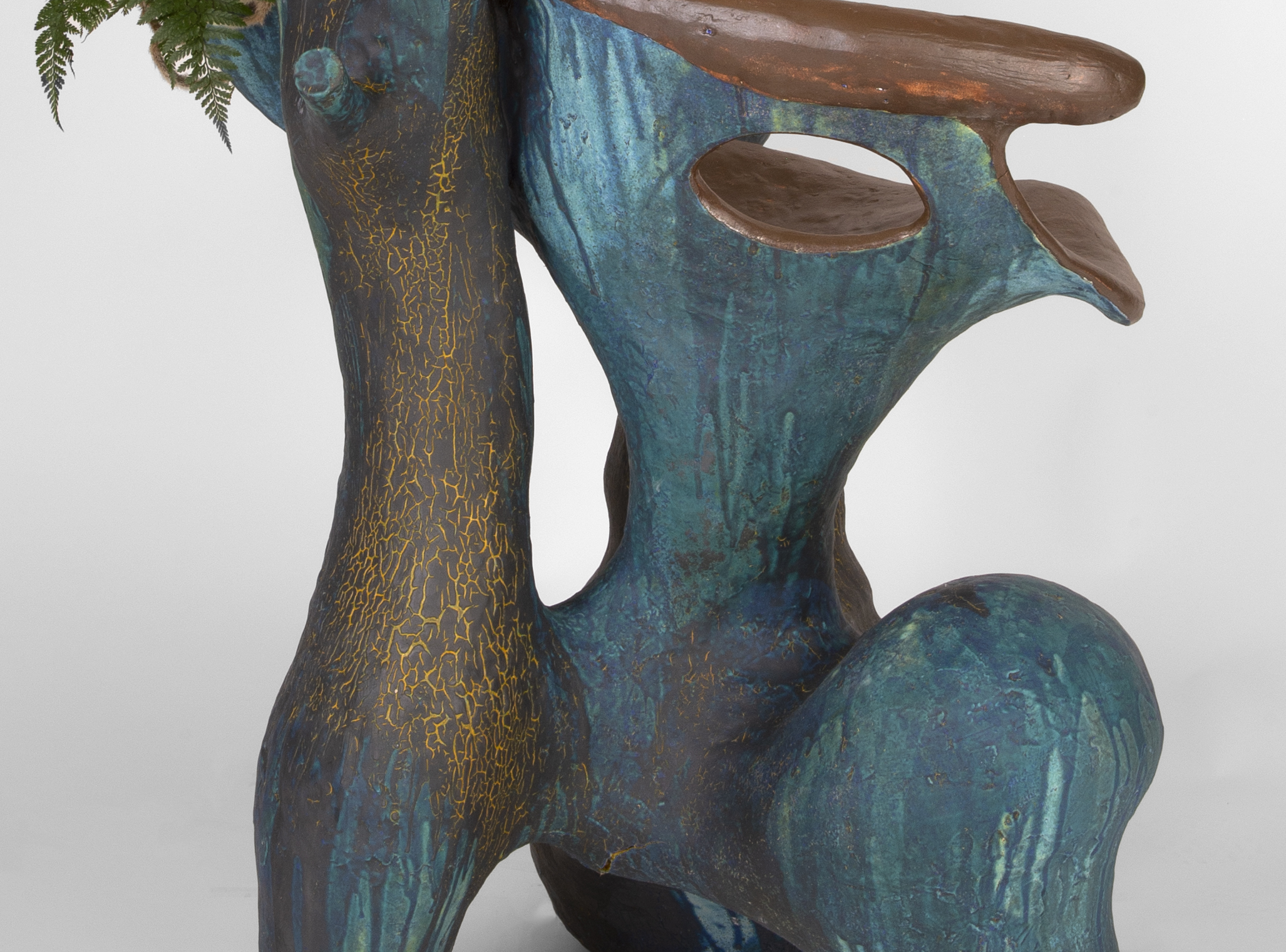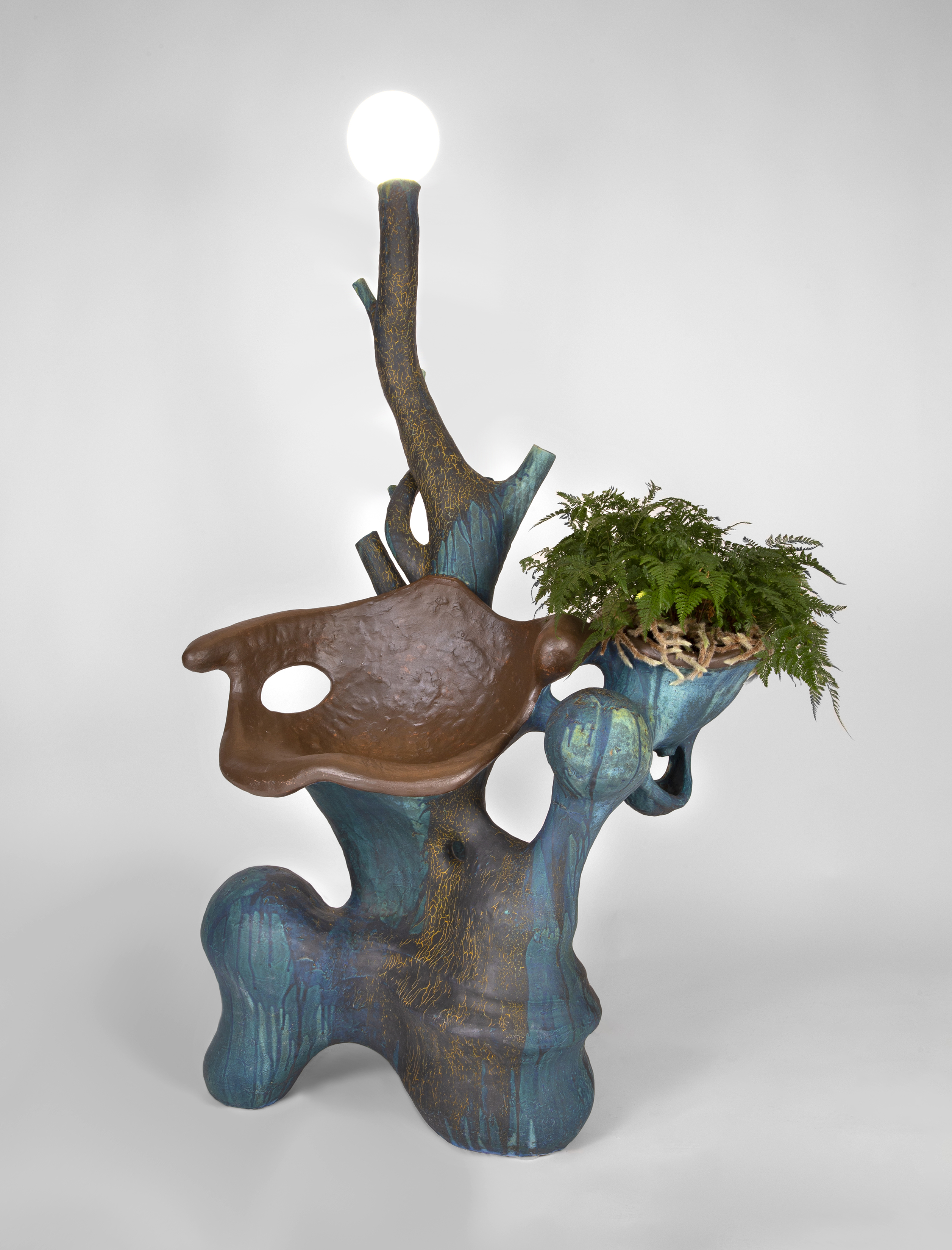 The Lamp Chair Coatrack Planter is a multi-functional ceramic sculpture, integrating seating, lighting, storage, and greenery. Its raw clay seat is designed to conform naturally to the body, offering a tactile, earthy finish. A striking blue crackle glaze runs throughout the piece, with golden-yellow hues emerging from the cracks, referencing the soft, warm light that illuminates the chair from overhead—ideal for reading. Organic, tree limb-like structures extend upward to serve as a coat rack, while a rabbit’s foot fern thrives in the integrated planter, with a concealed water-catching tray beneath to capture excess moisture. Despite its size, the piece is light enough to be moved easily by two people and stands solidly on a stable, tripod formation.